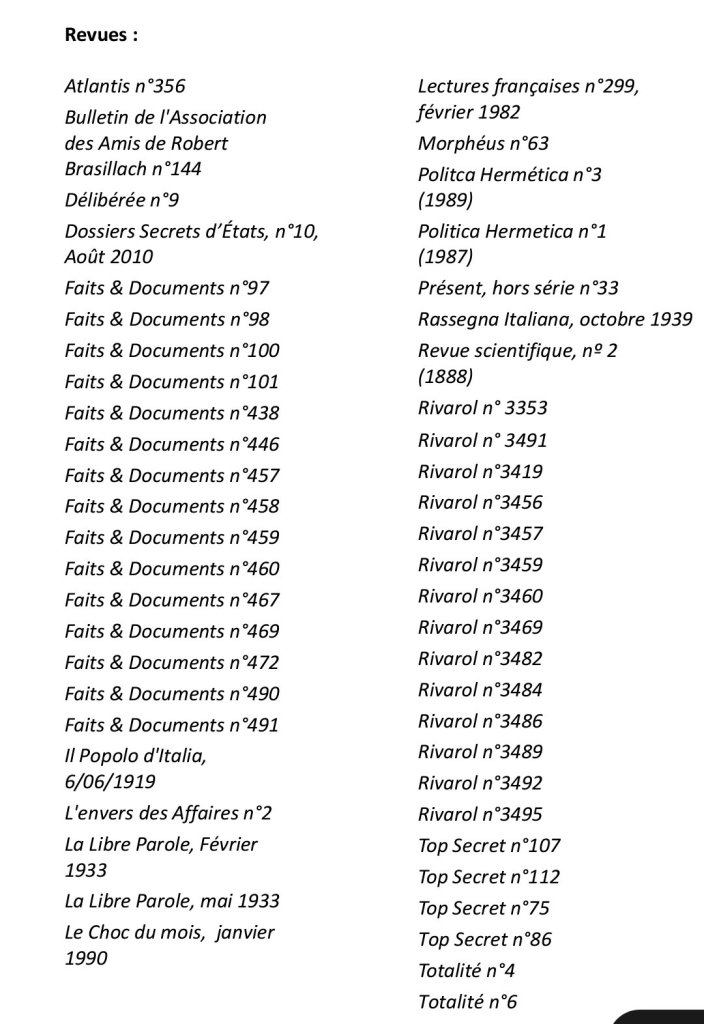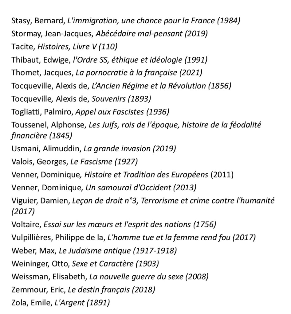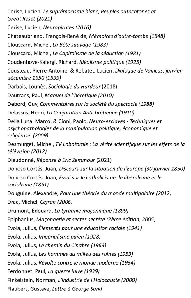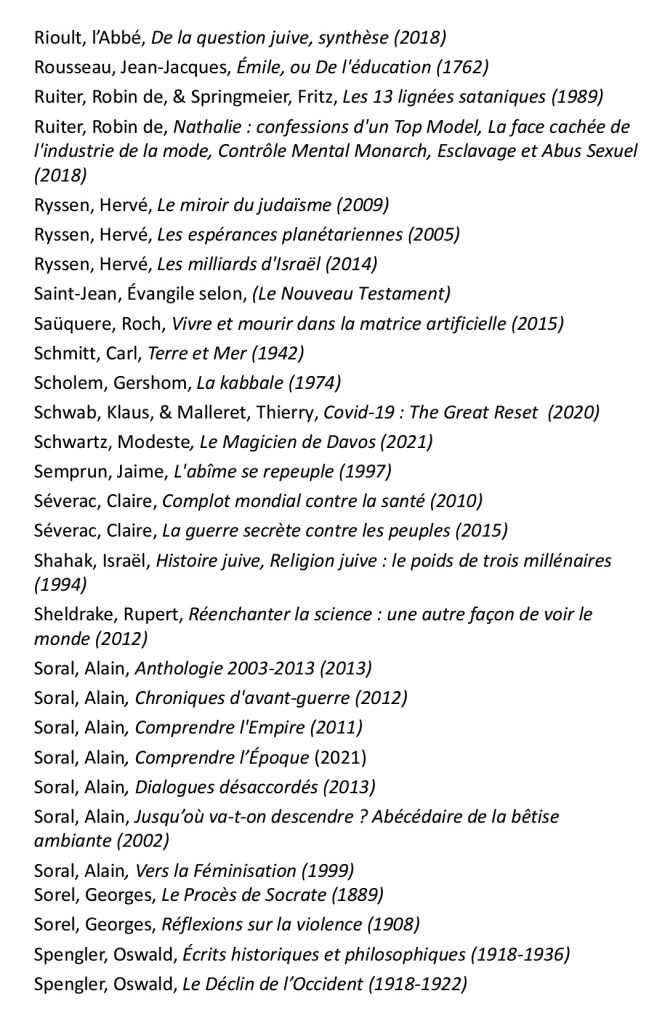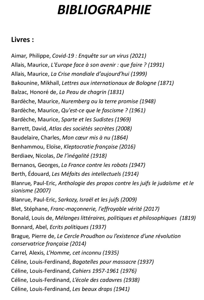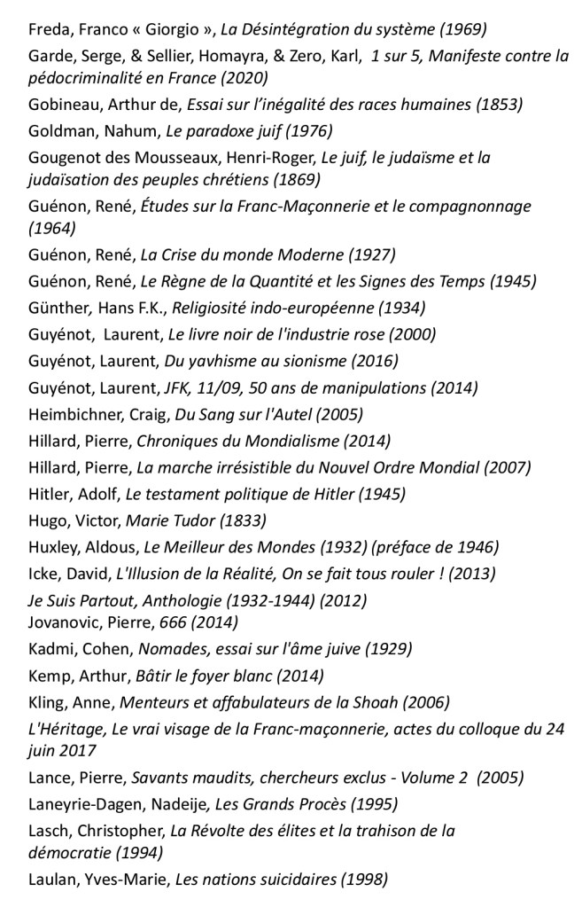 « Précisons d’emblée que cet Abécédaire du Nouvel Ordre Mondial n’est pas fait pour les tièdes, les modérés, les adeptes de la bien-pensance et de la politique du ventre mou. Arthur Sapaudia a puisé ses sources parmi des livres qui ont pour la plupart peu de chances de se trouver sur les rayons de la FNAC et des médias qui donnent des cauchemars aux promoteurs de la pensée wokiste. Vous voilà prévenus. Ça décoiffe du début à la fin de ce recueil de près de cinq cents pages. Ici, pas de langue de bois, on appelle un chat un chat et on pourfend à la hache toutes les fariboles cosmopolites. La liste des sujets abordés est extrêmement vaste : citons au hasard l’antiracisme, l’avortement, la disparition des Blancs, les chemtrails, le contrôle mental, le Covid, Disney, la Fabian Society, le féminisme, la franc-maçonnerie, la géo-ingénierie, le Great Reset, la GPA, HAARP, Hollywood, l’immigration, la kabbale, le national-sionisme, le Parlement Juif Européen, la pédocriminalité, le QUI, le rapport Kinsey, le club Le Siècle, la surveillance généralisée, l’Institut Tavistock, le transhumanisme, le wahhabisme… »