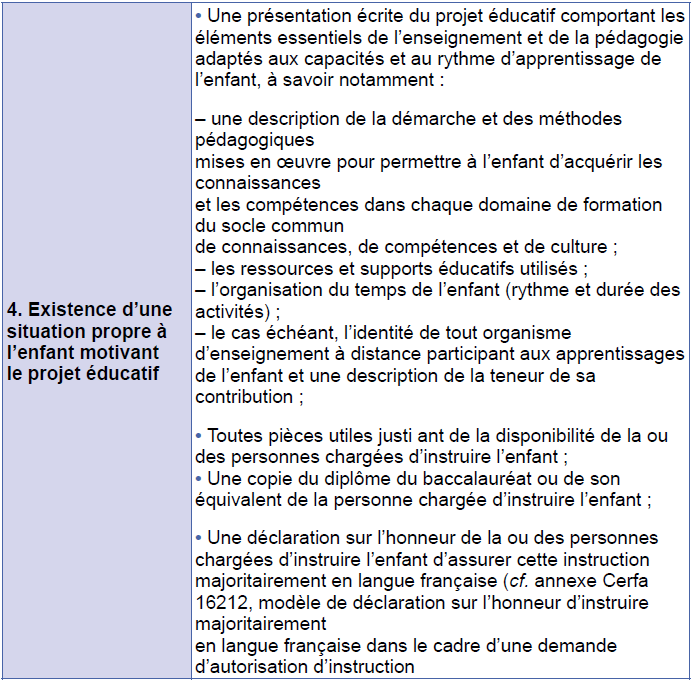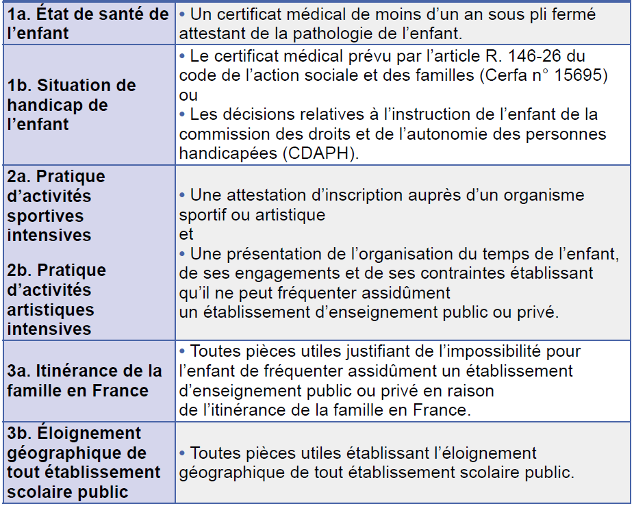 On peut demander l’autorisation d’instruire son enfant dans la famille pour les quatre motifs suivants – dans la case d’en face, les pièces justificatives à fournir :