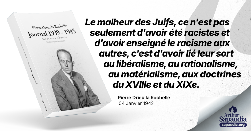 – Ce que je reproche à Hitler, ce n’est donc pas d’être raciste, c’est de l’être bêtement. Il veut faire l’Europe? Il a parfaitement raison. S’il réussit, il sera le plus grand homme des temps modernes. Il veut faire une Europe allemande ? Il n’a pas tort non plus. Les Allemands sont sérieux, sont solides, sont honnêtes. C’est le peuple le plus doué pour l’organisation de tout le continent. La folie de Hitler, c’est de vouloir faire l’Europe en excluant les Slaves, les Tziganes, les Juifs. Que ça nous fasse plaisir ou non, une bonne moitié des idées qui ont formé, déformé, bouleversé ou modelé l’âme européenne sont, ou des idées juives, ou des idées transmises par des Juifs : christianisme, thomisme, rationalisme, marxisme, freudisme… même le nazisme, ainsi que tu l’as fort bien remarqué, est une doctrine typiquement juive ! D’ailleurs Nietzsche lui-même écrit en toutes lettres dans Par-delà le bien et le mal…