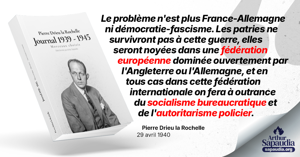 Pourquoi ne suis-je pas communiste ? Mais pourquoi ne suis-je pas réactionnaire ? Parce que je suis un petit bourgeois et que je ne crois qu’aux petits bourgeois. Cette espèce de petits bourgeois qui tient du petit noble, du bourgeois des professions libérales, du paysan, de l’artisan. Mais qui n’aime ni le fonctionnaire, ni l’employé, ni l’ouvrier d’usine quand ils ont oublié leur origine concrète. Rien n’a jamais été fait que par nous. Et le socialisme sera fait par nous ou ne sera pas fait. Nous craignons tout et nous n’avons peur de rien. Nous craignons l’Église et la Franc‑Maçonnerie, le prolétariat et le capitalisme, la France et l’Europe, l’Allemagne et la Russie, mais nous persistons. Nous avons déjà fait ce régime qui se casse, nous en referons un autre. Nous sommes la masse des individus, le liant de toutes les classes. Nous sommes les hors‑classe, les hommes libres.